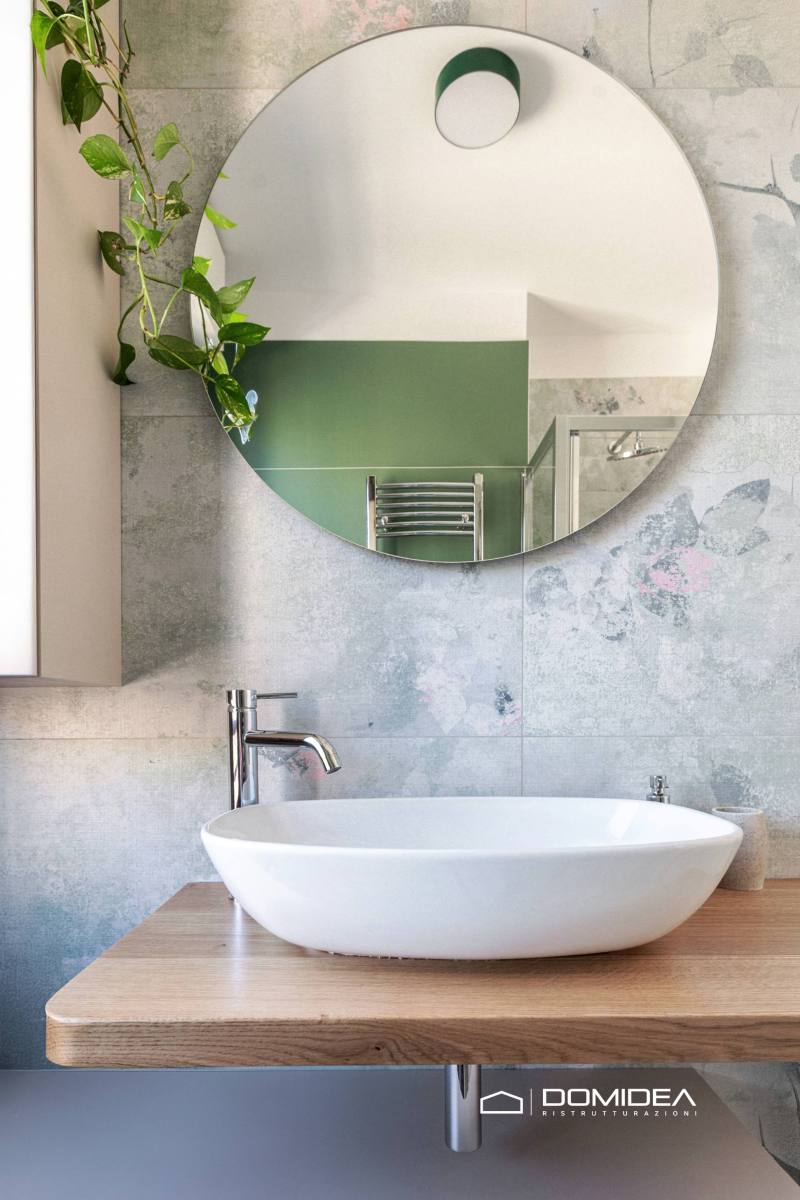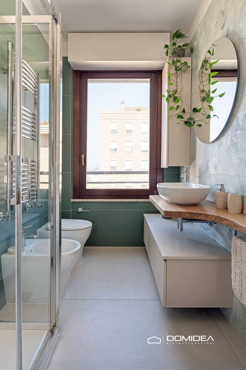 La palette colori si sviluppa su tonalità neutre e luminose come beige, tortora e grigio chiaro, arricchite da accenti verdi negli arredi e nelle decorazioni. Il legno naturale diventa il filo conduttore del progetto, utilizzato nelle superfici verticali e negli elementi di arredo su misura.