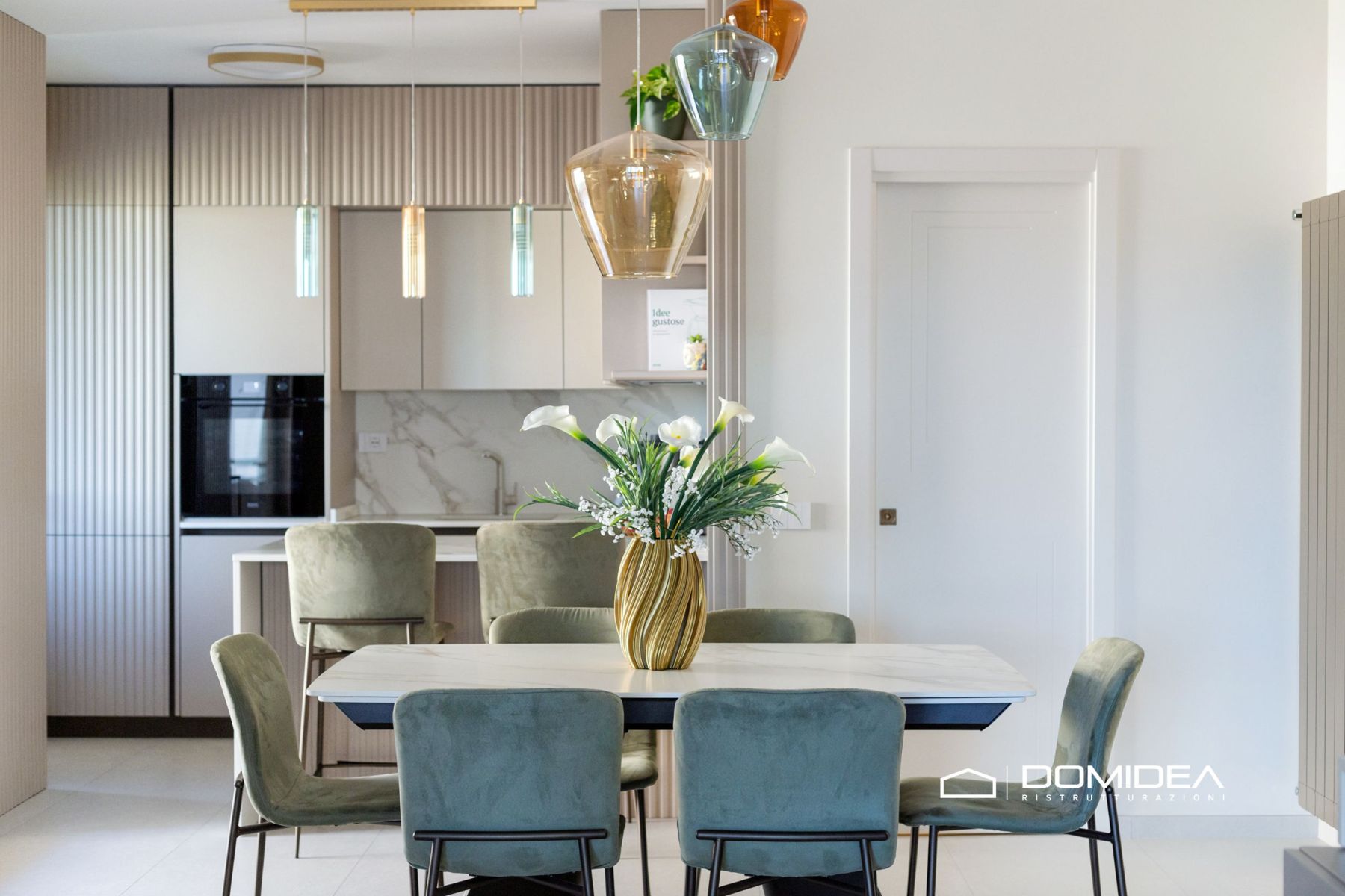 Sospese sopra il tavolo padronale le lampade in vetro colorato rappresentano un elemento scenografico importante: oltre a illuminare lo spazio, contribuiscono a definire l’identità estetica della zona pranzo.