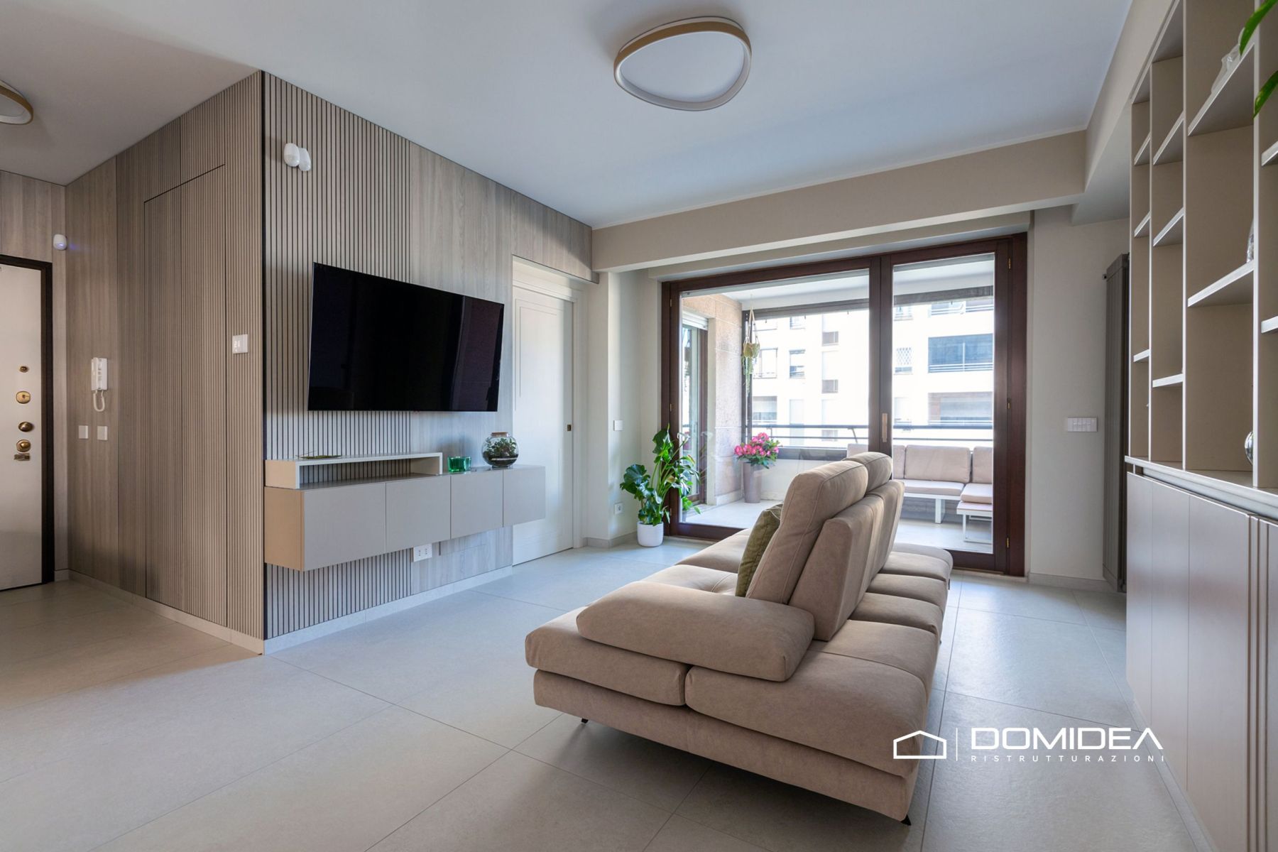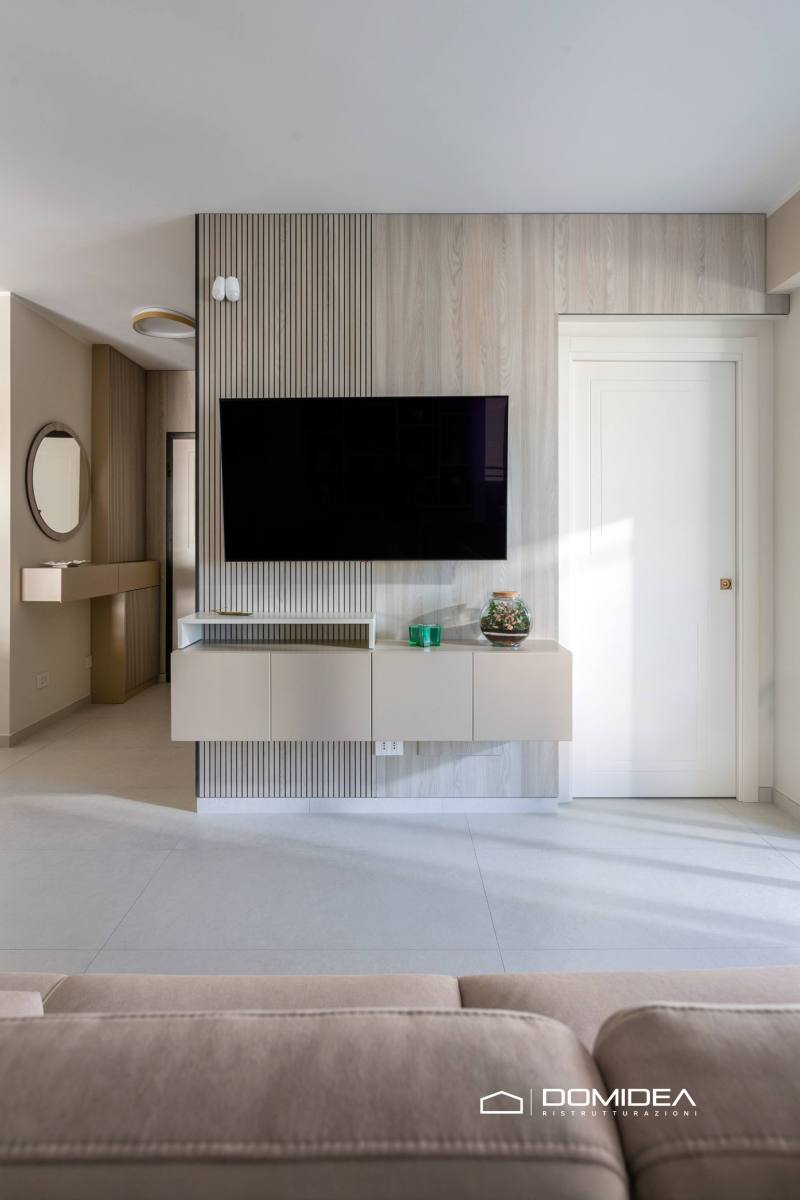 Un elemento distintivo del living è la parete con doghe verticali in legno, che aggiunge profondità visiva e definisce l’area TV con uno stile moderno e sofisticato.