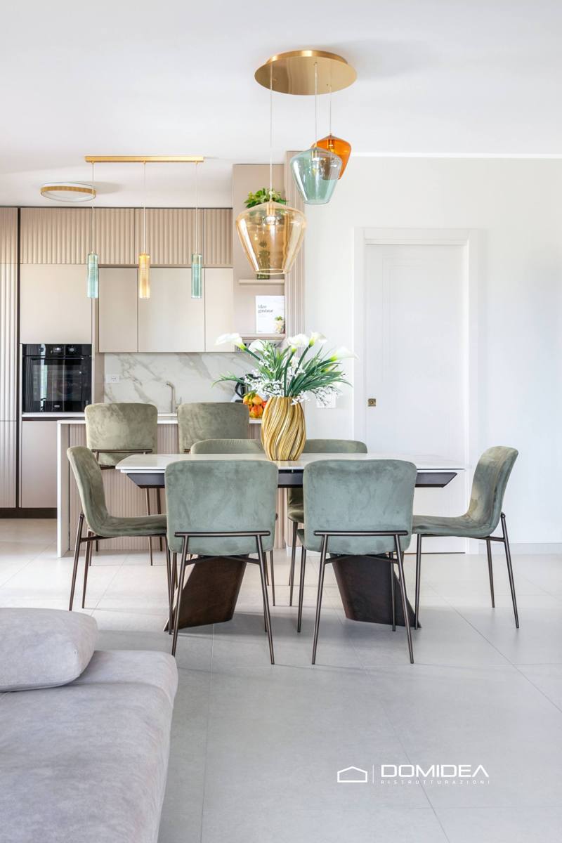 Sempre nello stesso spazio l’area dining è valorizzata da un tavolo moderno accompagnato da sedute imbottite in velluto verde, che introducono un elemento cromatico raffinato.